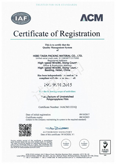 Certification of EQ (Environment Management System) of Hebei taida packing material Co., Ltd.